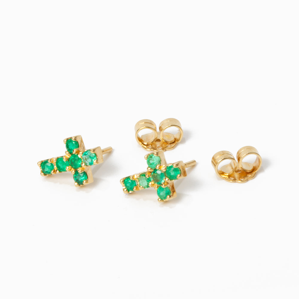 Aretes de Cruz en Esmeraldas con broche estilo Mariposa con 1cm de alto en oro amarillo 18k.
