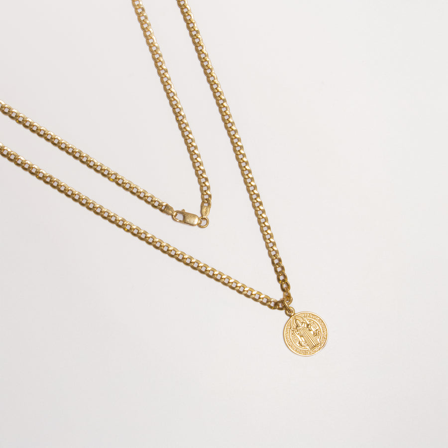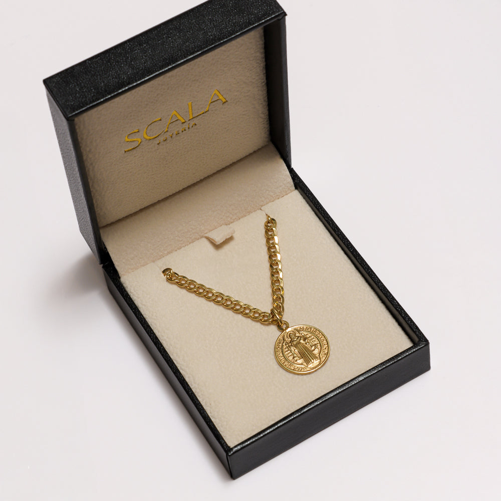 Cadena tejido cubano de 60 cm de largo 4mm de ancho en oro italiano 18k + Dije de San Benito de 16mm de diámetro en oro italiano 18k.