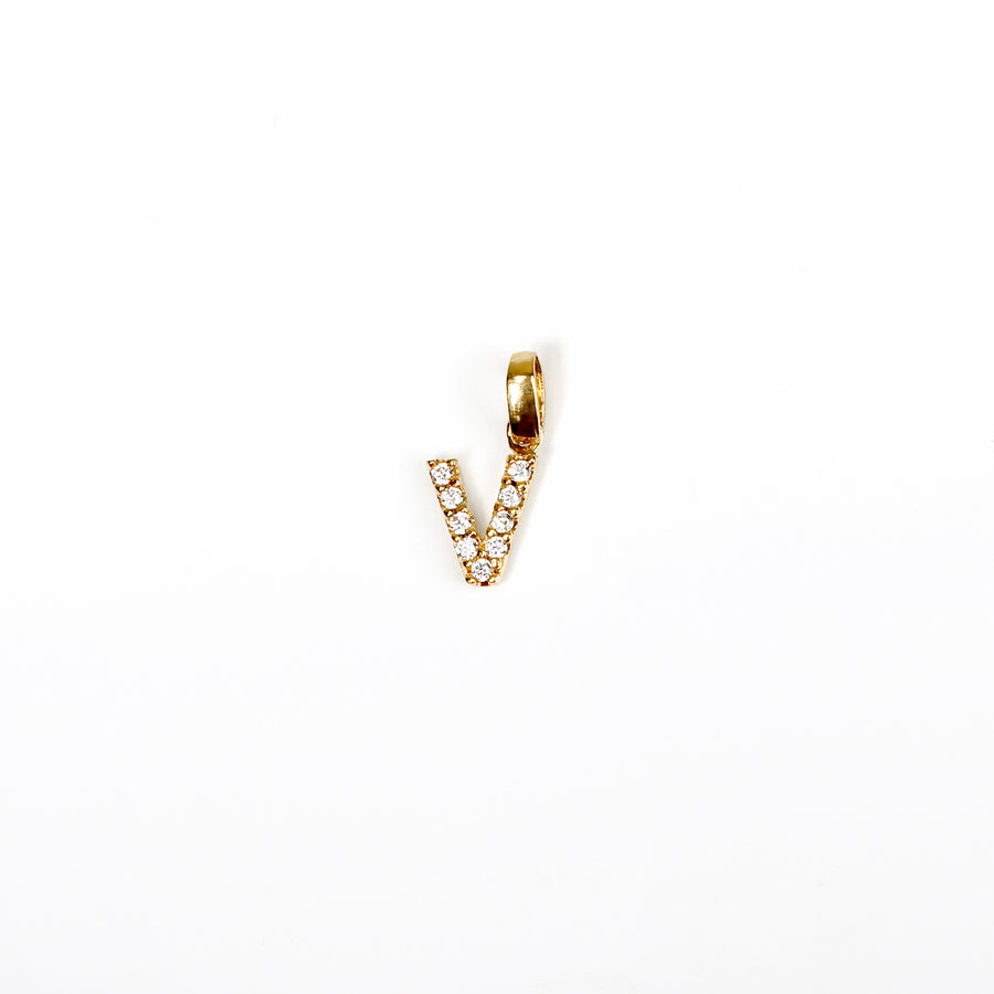Dije letra "V" oro amarillo con circones blancos de 1.2cm en oro italiano 18k.