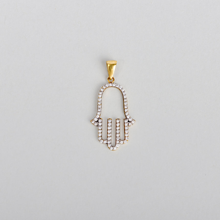 Dije de silueta de mano con circones de 3.2 cm de largo en oro italiano 18k.