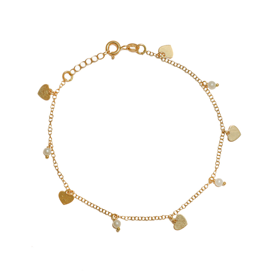 Pulsera con dijes de corazón y bolitas blancas en oro blanco italiano 18k.